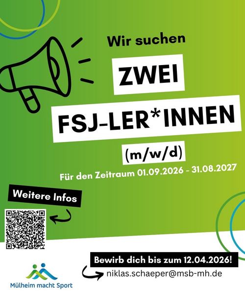 Der Mülheimer Sportbund e.V. und der MülheimerSportService suchen jeweils zum 01. September 2026 einen Freiwilligendienstleistenden (FSJ im Sport). Wir suchen Dich!