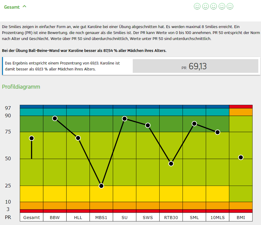 Im Sportportal finden Sie einen Überblick aller Übungen. Außerdem können Sie dort anhand ermittelter Werte sich die dazugehörigen Prozentränge ausgeben lassen.
